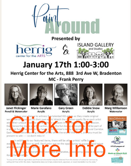 Big news! On January 17, 1:00-3:00 PM we are having a Paint Around at the new Herrig Center for the Arts. Five Island Gallery artists will take turns painting on canvases that are passed from artist to artist to add their own unique touch to the painting. Paintings will be raffled at the end. Winners must be present to win.